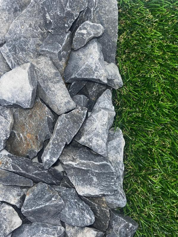 Slate Chips #467 are a rugged and stylish decorative aggregate made from crushed slate rock, ranging in size around 1.5 inches. Their rich, natural hues of gray and purple, along with their larger size, make them a popular choice for both construction and landscaping projects. In construction, they provide a stable base layer for roads, foundations, and drainage systems, while in landscaping, they add a sophisticated touch to pathways, patios, and garden borders. Their durability and excellent drainage properties make them a practical and visually appealing option for a variety of outdoor designs.