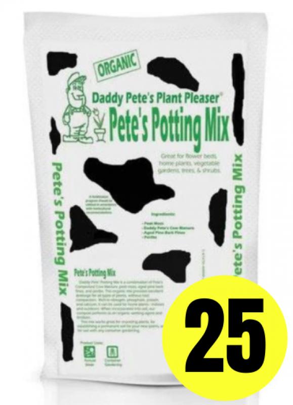 Transform your soil with the enriching Daddy Pete's Organic Potting Mix. Meticulously formulated, this premium soil conditioner combines Daddy Pete's Composted Cow Manure, aged pine bark, vermiculite, and dolomitic lime to create a perfect blend for all root types. Abundant in phosphate, nitrogen, potash, and calcium. This product is notable for all container planting and re-potting your favorite plants.